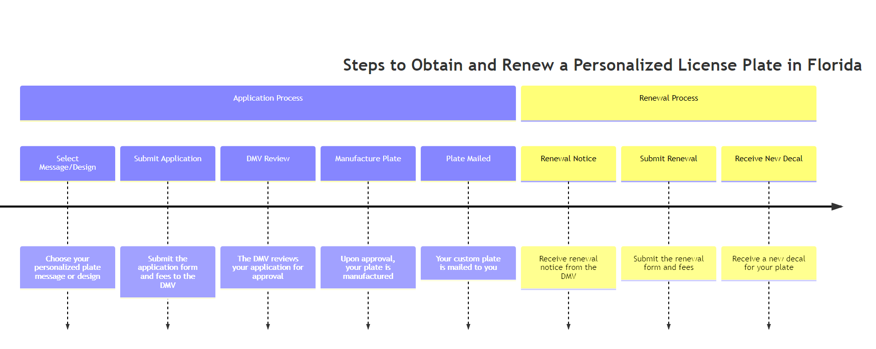 But before you start, let’s take a visual journey through the process. Below, we’ve provided a diagram illustrating the steps involved in obtaining a personalized license plate in Florida, from the initial application to the renewal process.